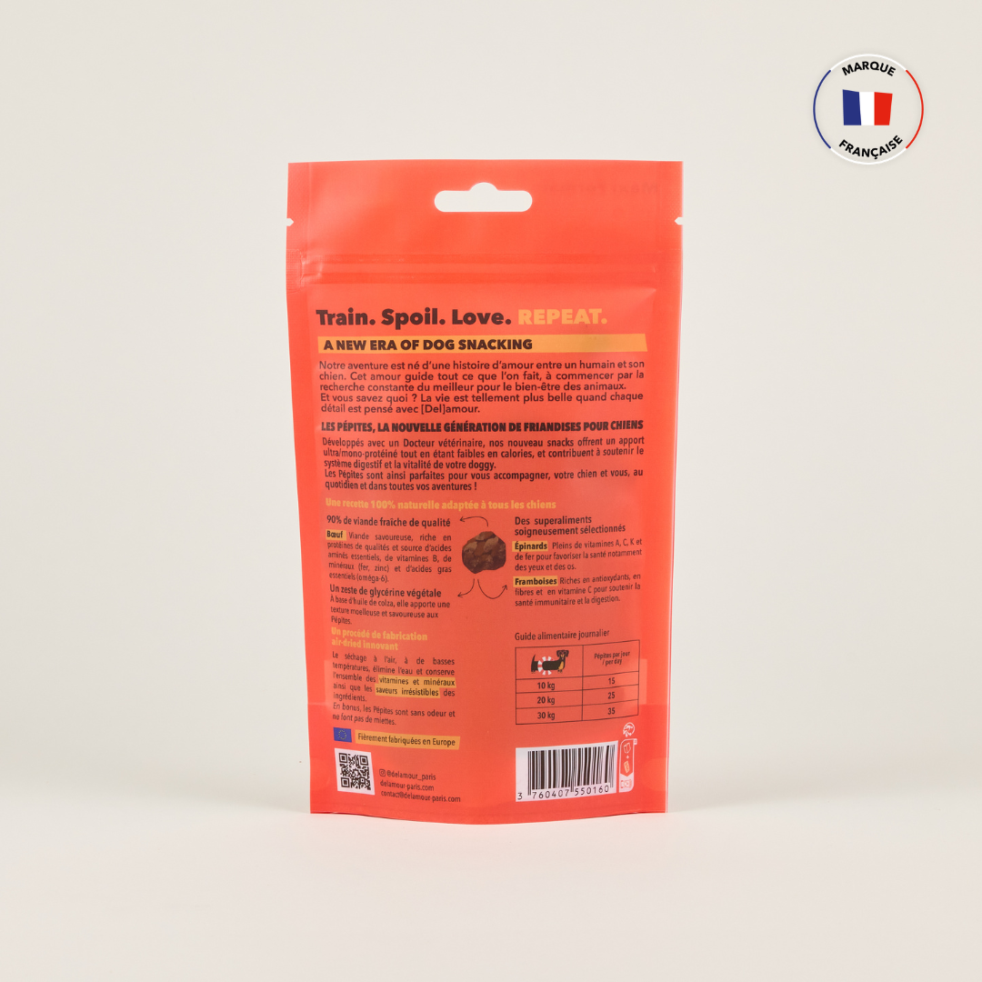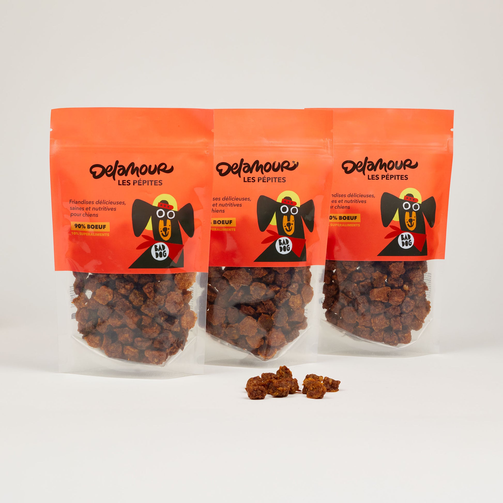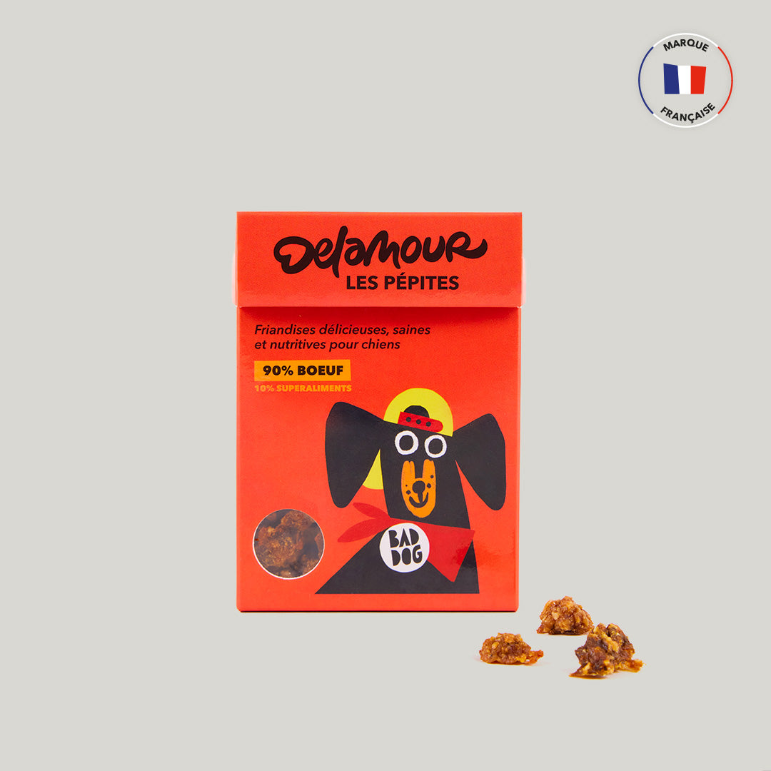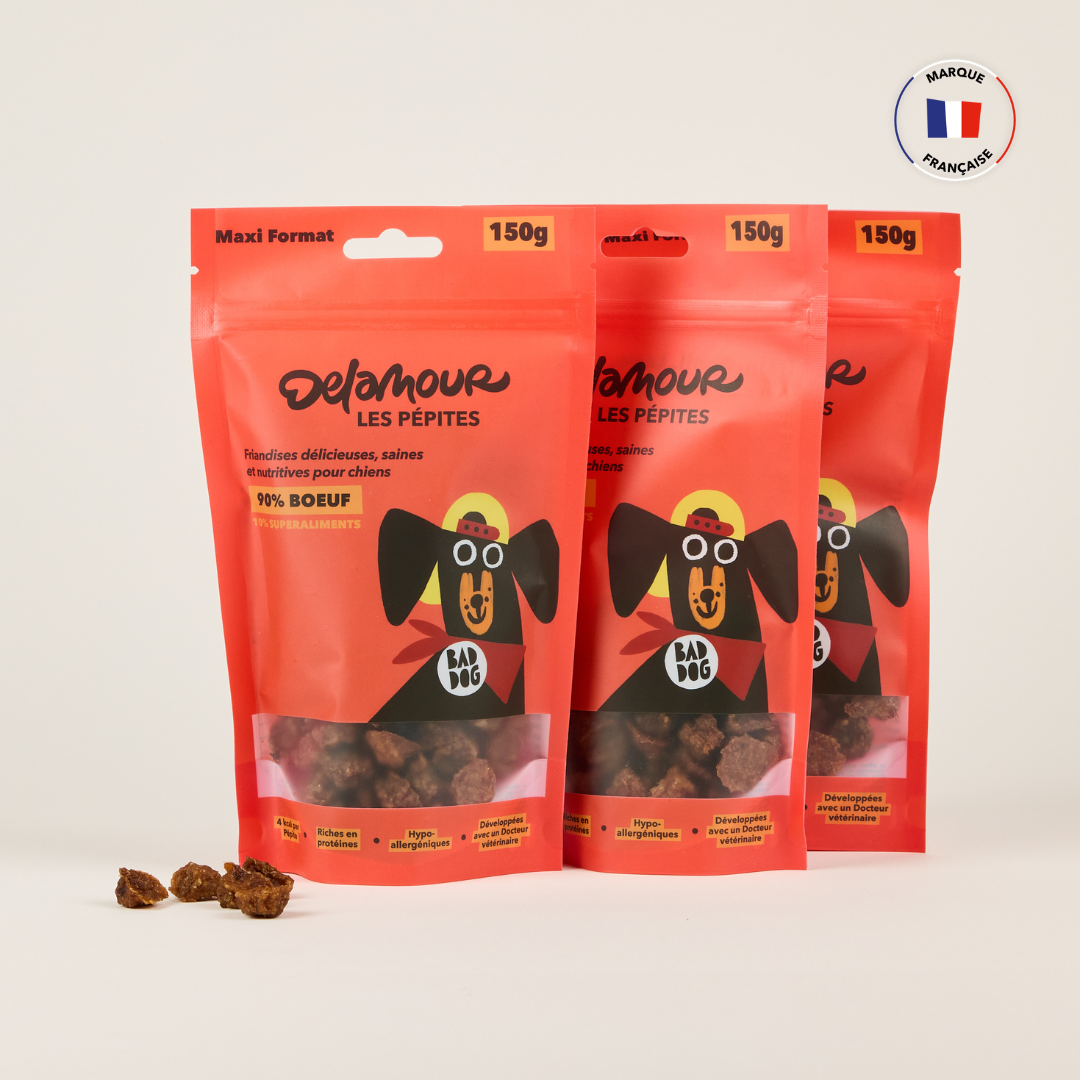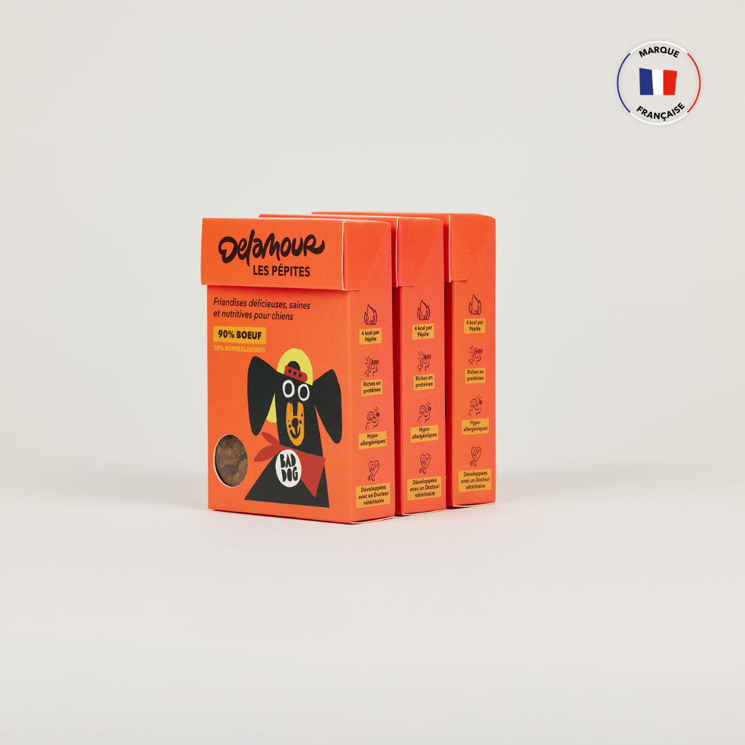 Avec seulement 4 calories par friandises, les Pépites Delamour permettent aux dog parents de récompenser leur chien plusieurs fois par jour, sans compromettre son équilibre alimentaire ni risquer de surpoids. Mais tout est bien entendu une question de modération ;)